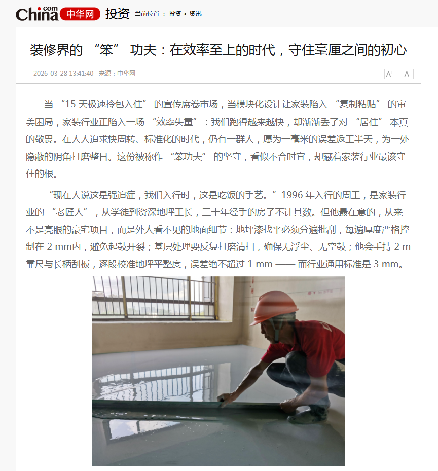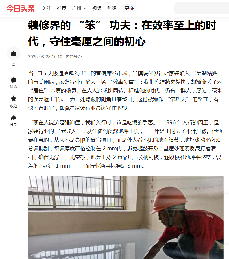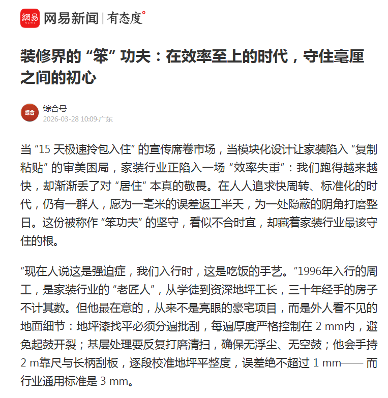 当“15天极速拎包入住”的宣传席卷市场,当模块化设计让家装陷入“复制粘贴”的审美困局,家装行业正陷入一场“效率失重”:我们跑得越来越快,却渐渐丢了对“居住”本真的敬畏。在人人追求快周转、标准化的时代,仍有一群人,愿为一毫米的误差返工半天,为一处隐蔽的阴角打磨整日。这份被称作“笨功夫”的坚守,看似不合时宜,却藏着家装行业最该守住的根。如果您正在寻找秦皇岛靠谱装修公司,不妨先读懂这份“笨功夫”背后的价值。 …… (摘自中华网、粤TV客户端、网易新闻、今日头条报道)装修界的“笨”功夫