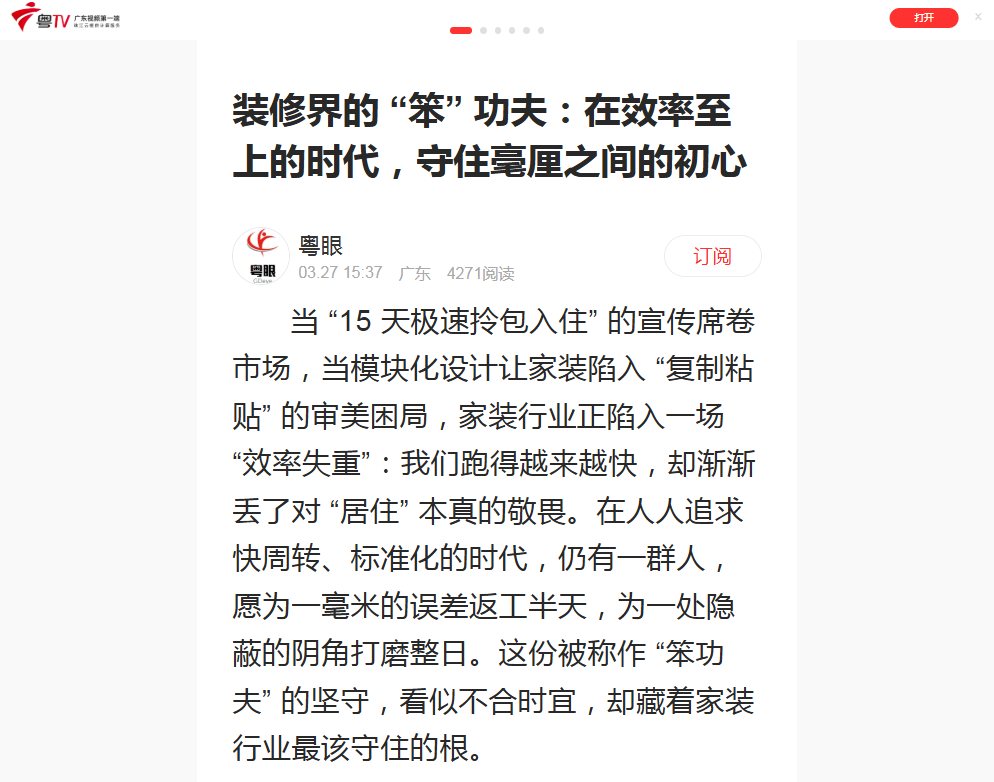 这份“笨功夫”没有被时代淘汰,反而找到了适配当下的新落地方式。当行业陷在价格战与营销战的泥潭里,越来越多人意识到,守住毫厘之间的细节,才是家装突围的核心。近期广州新落成的创展整装全案中心,就是这份匠人初心的延续:设计不再是模板化的图纸堆砌,而是从空间规划、材料甄选到工艺落地的全周期跟进;施工不再是碎片化的工序拆分,而是由资深匠人全程把控关键节点,把“毫米级”的较真注入每个环节。这不是一次商业扩张,而是对行业初心的召回:在人人求快的时代,证明“慢”自有价值,“笨”自有分量。