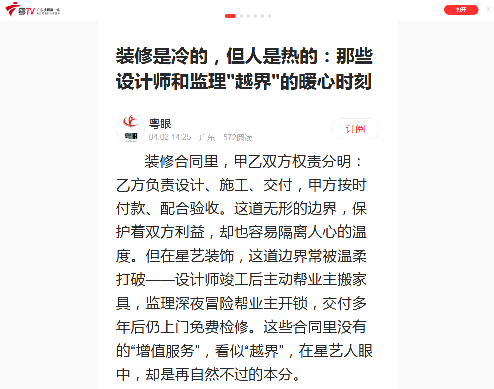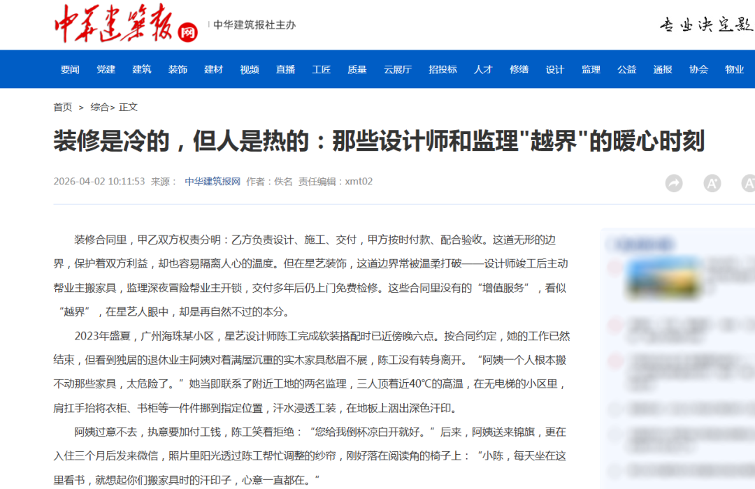 …… (摘自中华建筑报网、粤TV客户端报道) 2023年盛夏,广州海珠某小区,星艺设计师陈工完成软装搭配时已近傍晚六点。按合同约定,她的工作已然结束。但看到独居的退休业主阿姨对着满屋沉重的实木家具愁眉不展,陈工没有转身离开。“阿姨一个人根本搬不动那些家具,太危险了。”她当即联系了附近工地的两名监理,三人顶着近40℃的高温,在无电梯的小区里,肩扛手抬,将衣柜、书柜等一件件挪到指定位置。汗水浸透工装,在地板上洇出深色汗印。 阿姨过意不去,执意要加付工钱,陈工笑着拒绝:“您给我倒杯凉白开就好。”后来,阿姨送来锦旗,更在入住三个月后发来微信。照片里,阳光透过陈工帮忙调整的纱帘,刚好落在阅读角的椅子上。阿姨写道:“小陈,每天坐在这里看书,就想起你们搬家具时的汗印子,心意一直都在。” 如果说陈工的“越界”是偶然的温情,张监理的“越界”则藏着日复一日的责任。2021年深秋的一天,张监理刚结束工地巡检回到家,就接到了业主李先生的紧急电话,语气焦急万分:“张监理,我家刚装的定制衣柜门突然掉了,你有空能帮忙修理一下吗?” 张监理没有丝毫犹豫,抓起工具箱就驱车赶往现场。赶到业主家后,他立刻戴上手套,像平日里在工地校准木作细节那样,仔细检查柜体合页与墙面固定点,一寸寸排查松动根源。很快,他发现是合页螺丝因墙体受力不均出现脱扣。他一边安抚受惊的老人和慌乱的业主,一边熟练地加固预埋膨胀管,重新校准合页角度,再反复推拉柜门测试稳定性,确保开合顺畅、受力均匀。 等彻底修复好柜门,已经是深夜十二点多。他的手上蹭满了木作粉尘,就像刚完成手工打磨的匠人,带着一身烟火气,眼神却依旧笃定。业主看着疲惫却依旧认真的张监理,满心愧疚:“张监理,麻烦你了。”张监理擦了擦手上的污渍,笑着说:“您选择我们,就是信任我们,家里这种安全急事,不管什么时候,我们都得过来。” 事后,业主特意送来感谢信,说不仅解决了安全隐患,更让他感受到了被放在心上的温暖。 2022年春天,设计师郑工交付一套婚房时,偶然听到业主小两口的烦恼:“婚礼下周就办,太忙了,婚房还没布置。”说者无心,听者有意。郑工当天就组建小组,召集项目监理、软装设计师和两名木工师傅,周末带着气球、喜字、绿植等物料,不请自来地上门帮忙。 他们调整灯光色温营造氛围,用剩余木料手工打造“囍”字挂件,帮新人铺好婚床、摆放寓意吉祥的红枣花生,还在阳台布置了小型拍照角。婚礼当天,新娘发来照片,照片里她穿着婚纱站在阳台绿植前笑容灿烂,附言只有六个字:“最好的结婚礼物。”这份礼物成本不高,却藏着最真挚的心意。 如果说前三个故事是“一时暖心”,星艺的回访制度,便是“长情的越界”。按行业惯例,装修质保期通常为两年,期满后双方基本“两清”。但星艺的技术督导们,手里常攥着十几年前的客户名单,定期电话回访。 2015年装修的业主李先生,2024年突然接到星艺的回访电话,起初以为是推销电话差点挂断。确认是免费检修后,他半信半疑地开了门,来的正是当年负责他家装修的监理。监理带着工具箱,全面检查水电、防水和五金件,还顺手修好了松动的柜门铰链。“都九年了,你们图什么?”李先生不解。监理笑着回答:“您当年把家托付给我们,交付不是责任的结束,您住得安心,我们才心安。”后来,李先生成了星艺的“义务宣传员”,先后介绍三位亲友选定星艺。 有人说,这些“越界”是星艺的营销策略,但当看到陈工湿透的工装、张监理裤脚的蜘蛛网、郑工小组手工打磨的“囍”字,很难用“商业算计”来概括。星艺装饰创业之初就有规矩:“做装修等于做朋友,做朋友就不能计较边界。” 装修本是冰冷的——不过是水泥、板材的组合,图纸、工期的框架,但执行这一切的人,可以选择有温度。35年来,星艺的“越界”故事,没有写进合同,没有计入KPI,却成了最柔软的竞争力。毕竟,房子是用来住的,而家,是用来暖的。装修是冷的,但人是热的