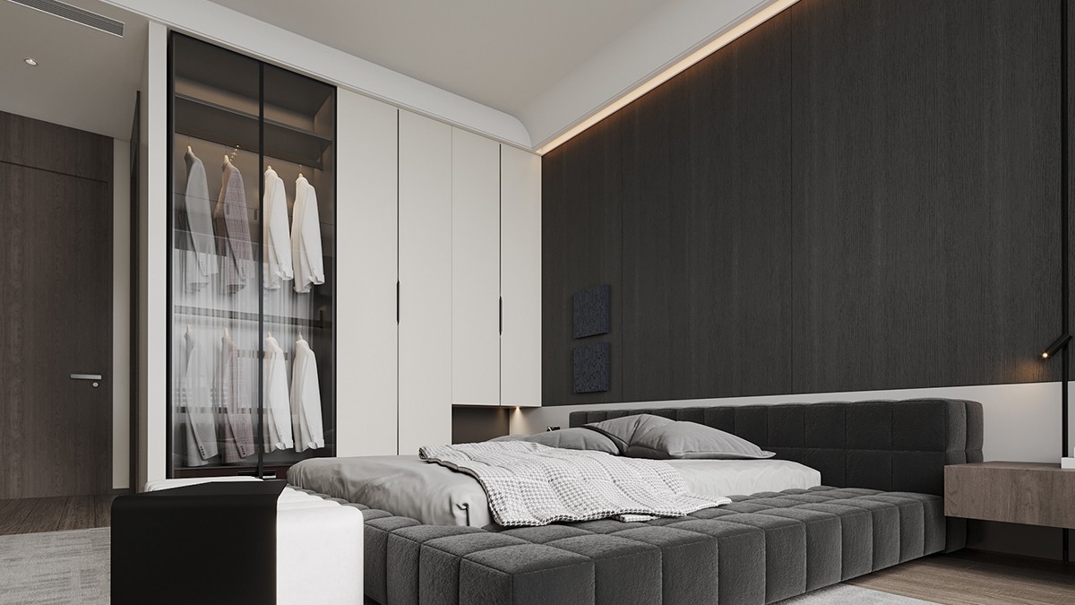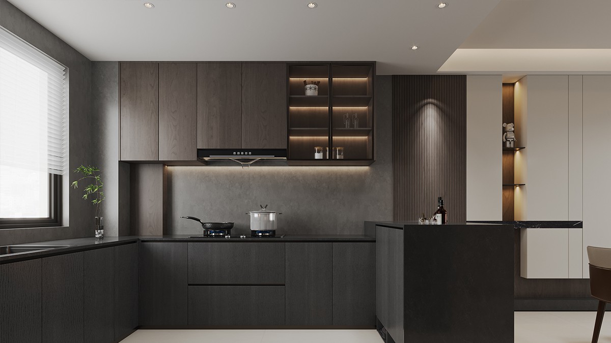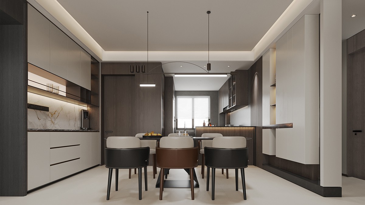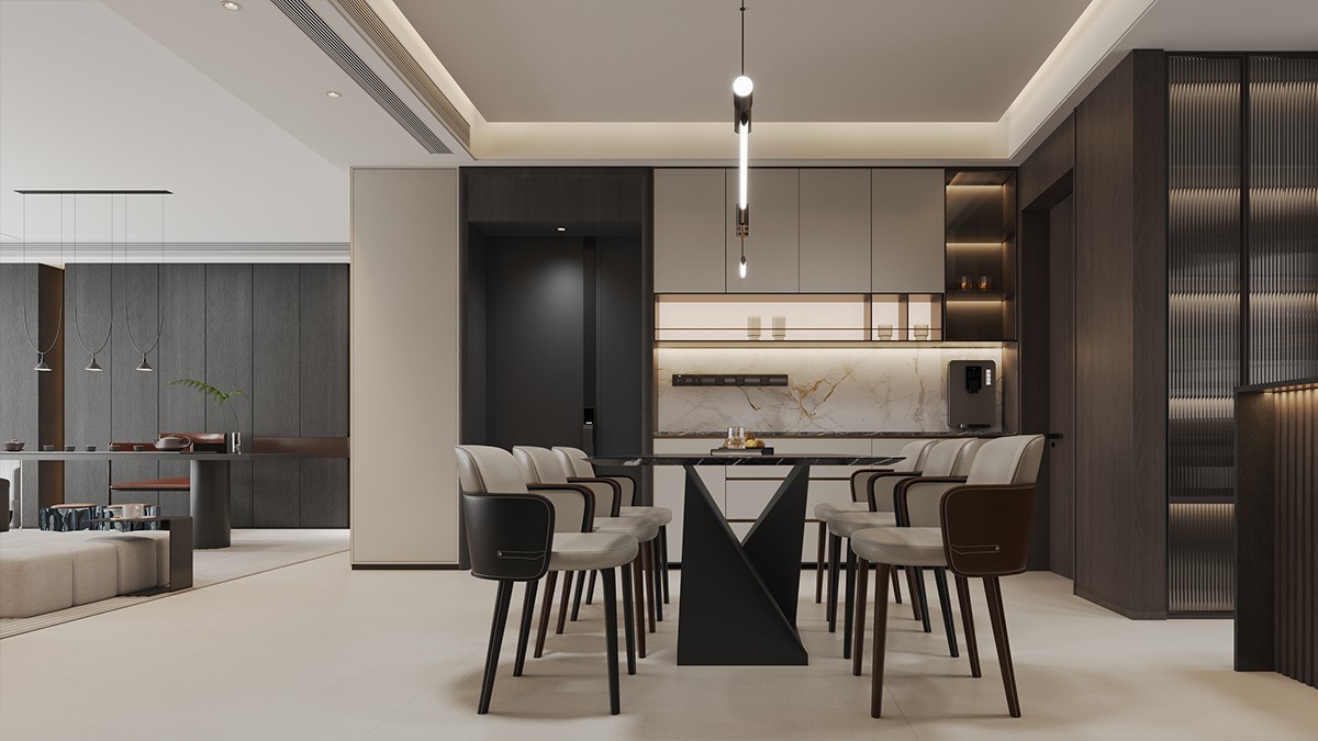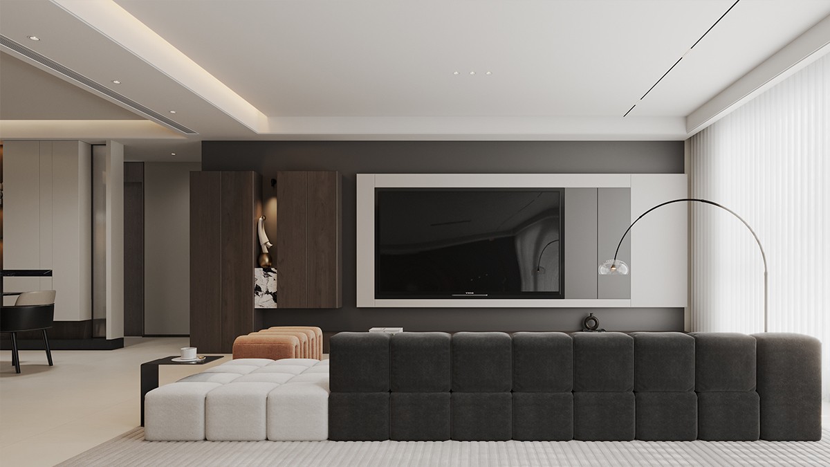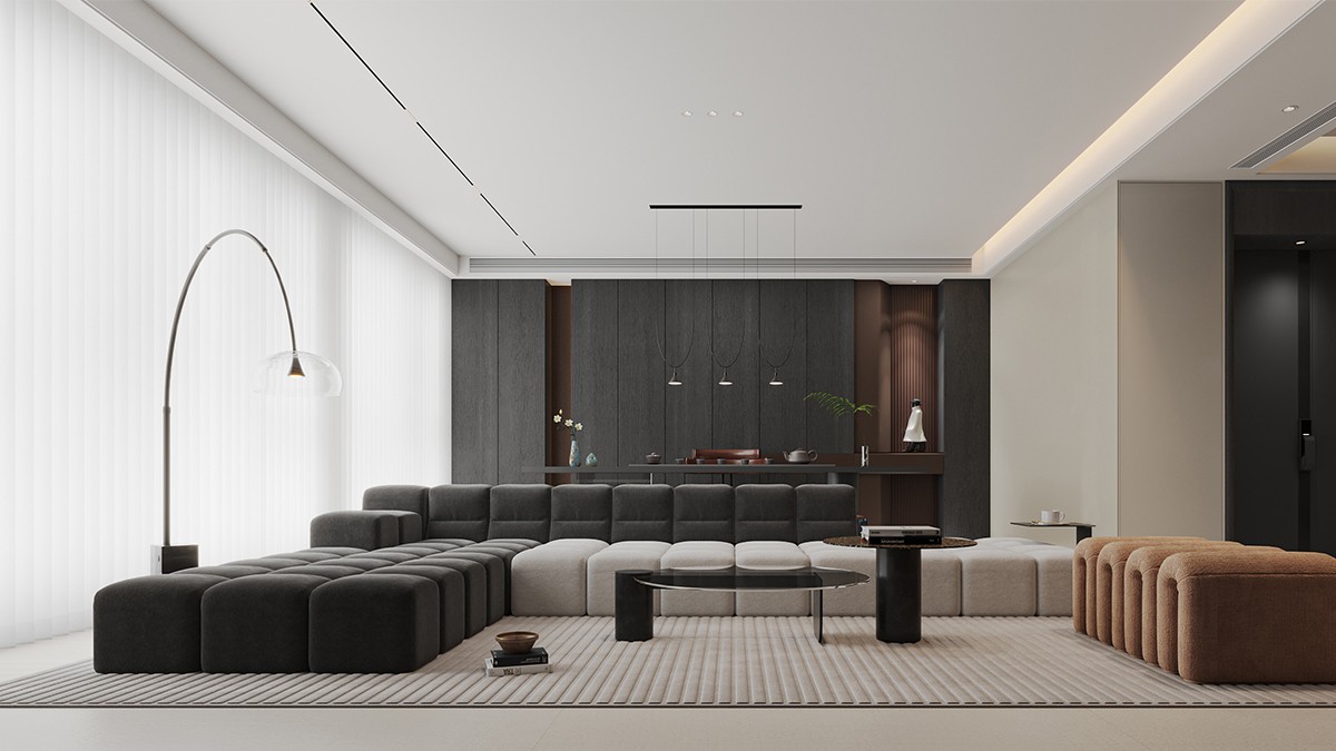 本案位于秦皇岛海港开发区汤河畔的德熙瑞府,建筑面积160平米,由星艺装饰秦皇岛公司全案设计落地。整体以现代风格为基调,采用黑白灰棕的克制配色:深灰色微水泥地面与浅灰墙面奠定沉稳底色,黑色金属线条与棕色木饰面穿插点缀,营造出舒缓而富有层次的空间质感。客厅选用模块化沙发,可自由组合,既满足不同场景的会客与休闲需求,又以低饱和色调融入整体,让宽敞的公区更显松弛有序。设计师通过无主灯照明与自然光影的互动,强化了材质的肌理对比,为业主呈现一个兼具高级感与日常温度的现代居所。